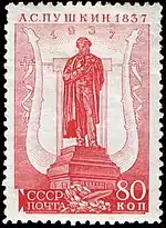 - Серия «100-летие со дня смерти поэта А. С. Пушкина»: памятник А. С. Пушкину в Москве, красная. Печать типографская на мелованной бумаге без водяного знака, перфорирована: линейная зубцовка 12½ (на каждые 2 сантиметра края марки приходится 12½ зубцов). Разновидности по зубцовке: (ЦФА [АО «Марка»] № 540) (Mi #553A) — линейная 12½; (ЦФА [АО «Марка»] № 540А) (Mi #553C) — комбинированная линейная 14:12½; (ЦФА [АО «Марка»] № 540Б) (Mi #553D) — комбинированная линейная 11:12½ (все вышеперечисленные разновидности отпечатаны 10 февраля 1937 года на мелованной бумаге[10]), а также переизданная в июле 1937 года разновидность (ЦФА [АО «Марка»] № 540Д) (Mi #553H) с комбинированной гребенчатой зубцовкой 12½:12 на простой бумаге. В марочных листах по 50 (10×5) марок[1][11][12].