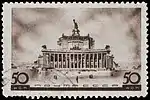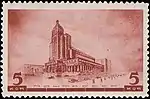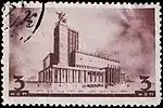- Серия «Архитектура Москвы»: Дворец Советов, фиолетовая. Фототипия на бумаге без водяного знака, перфорирована: линейная зубцовка 12½ (на каждые 2 сантиметра края марки приходится 12½ зубцов). Разновидности (ЦФА [АО «Марка»] № 549Б) (Mi #564B) — без зубцов. В марочных листах по 65 (5×13) марок[1][14][15].