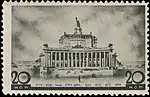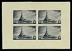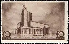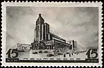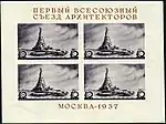 - Серия «Архитектура Москвы»: почтовый блок «I-й Всесоюзный съезд архитекторов» 120×90 мм из четырёх марок (ЦФА [АО «Марка»] № 549А) Дворец Советов, без зубцов (из блока), фиолетовая. Фототипия на бумаге без водяного знака, фиолетовый (марки) и печать типографская текст: «Первый Всесоюзный съезд архитекторов Москва — 1937» — светло-коричневый. Разновидность: блок (ЦФА [АО «Марка»] № 551-I) размерами 120×84 мм — без надпечатки текста[1][14][16].