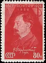 - Серия «Памяти Ф. Дзержинского»: портрет Ф. Дзержинского карминовая. Печать типографская на мелованной бумаге без водяного знака, (ЦФА [АО «Марка»] № 555) (Mi #569A) — перфорирована: линейная зубцовка 12½ (на каждые 2 сантиметра края марки приходится 12½ зубцов). Разновидность (ЦФА [АО «Марка»] № 555Б) (Mi #559B) — без зубцов. В марочных листах по 50 (10×5) марок[1][17][18].