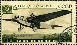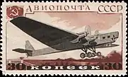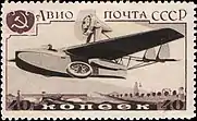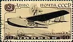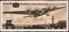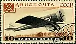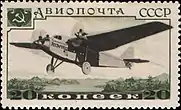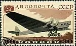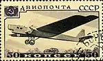 - Авиапочта. Серия авиапочтовых марок «Самолёты СССР»: самолёт АНТ-6, чёрная, коричневая. Фототипия на плотной бумаге с водяным знаком «1» на полях марочного листа, перфорирована: линейная зубцовка 12½ (на каждые 2 сантиметра края марки приходится 12½ зубцов). В марочных листах по 105 (7×15) марок[1][19][18].