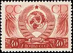 - Серия «Государственные гербы СССР и союзных республик»: герб СССР, кирпично-красная. Печать типографская на бумаге без водяного знака и металлография, перфорирована: линейная зубцовка 12½ (на каждые 2 сантиметра края марки приходится 12½ зубцов). В марочных листах по 100 (10×10) марок[1][20][21].