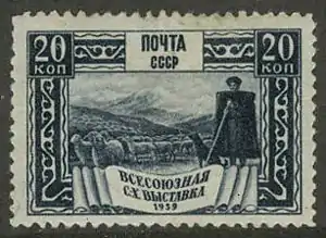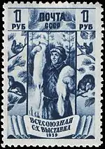 - Серия «Всесоюзная сельскохозяйственная выставка (ВСХВ) в Москве»: пушной промысел (растр «ВР»), тёмно-синяя. Глубокая печать, перфорирована: комбинированная гребенчатая зубцовка 12½:12 (на каждые 2 сантиметра края марки приходится 12½:12 зубцов). В марочных листах по 100 (10×10) экземпляров[1][14][15].