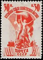 - Колхозница, лиловая. Типографская чёрная надпечатка длиной 11—12 мм нового номинала «30 коп» на марках (ЦФА [АО «Марка»] № 317) (Mi #368A). Печать типографская на бумаге с водяным знаком «ковёр», перфорирована: комбинированная гребенчатая зубцовка 12:12½ (на каждые 2 сантиметра края марки приходится 12:12½ зубцов). В марочных листах по 100 (10×10) марок[1][16][13].