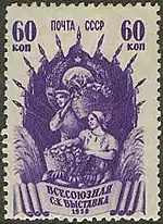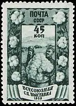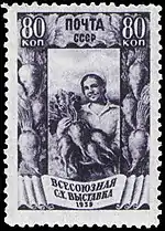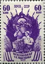 - Серия «Всесоюзная сельскохозяйственная выставка (ВСХВ) в Москве»: свекловодство (растр «ГР»), тёмно-лиловая. Глубокая печать, перфорирована: линейная зубцовка 12½ (на каждые 2 сантиметра края марки приходится 12½ зубцов). Разновидность (ЦФА [АО «Марка»] № 684Р) (Mi #707A) — растр «ВР». В марочных листах по 100 (10×10) экземпляров[1][14][15].