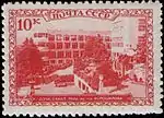 - Серия «Курорты СССР»: Сочи. Санаторий РККА имени тов. Ворошилова, красная. Фототипия на бумаге, без водяного знака, перфорирована: линейная зубцовка 12½ (на каждые 2 сантиметра края марки приходится 12½ зубцов). В марочных листах по 100 (10×10) экземпляров[1][18][20].