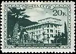 - Серия «Курорты СССР»: Сухуми. Санаторий имени С. Орджоникидзе, коричнево-лиловая. Фототипия на бумаге, без водяного знака, перфорирована: линейная зубцовка 12½ (на каждые 2 сантиметра края марки приходится 12½ зубцов). В марочных листах по 100 (10×10) экземпляров[1][18][20].