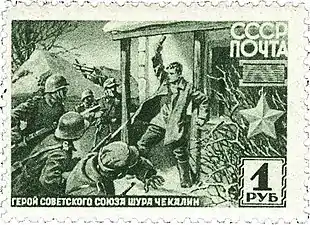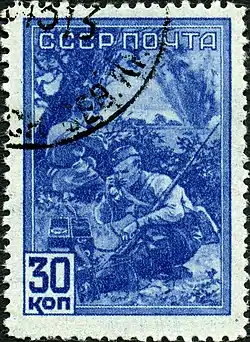 - Серия «Великая Отечественная война 1941—1945»: Пулемётчики, (27.XII.42) — коричневая. Памятный текст: «Разведчики Красной армии, смело действуйте в тылу у немцев». Фототипия, перфорирована: линейная зубцовка 12½ (на каждые 2 сантиметра края марки приходится 12½ зубцов). В марочных листах по 100 (10×10) марок[1][2][10].