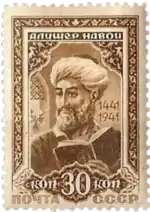 - Серия «500-летие со дня рождения Алишера Низамаддина»: портрет Алишера Навои, коричневая. Глубокая печать, перфорирована: комбинированная гребенчатая зубцовка 12½:12 (на каждые 2 сантиметра края марки приходится 12½:12 зубцов), 50 (10×5) экземпляров на марочных листах. Марки печатались блоками (или группами) по (5×5) + (5×5) марок, разделённых вертикальной дорожкой с образованием в средине марочного листа гаттер-пары[1][7][8].