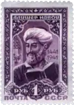 - Серия «500-летие со дня рождения Алишера Низамаддина»: портрет Алишера Навои, лиловая. Глубокая печать, перфорирована: линейная зубцовка 12½ (на каждые 2 сантиметра края марки приходится 12½ зубцов), 50 (10×5) экземпляров на марочных листах. Марки печатались блоками (или группами) по (5×5) + (5×5) марок, разделённых дорожкой с образованием в средине марочного листа гаттер-пары[1][7][8].