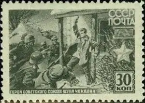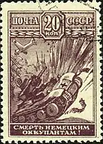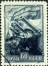- Серия «Великая Отечественная война 1941—1945»: бойцы противотанковой артиллерии, (30.XI.42) — чёрная. Памятный текст: «Смерть немецким оккупантам». Фототипия, перфорирована: линейная зубцовка 12½ (на каждые 2 сантиметра края марки приходится 12½ зубцов). В марочных листах по 100 (10×10) марок[1][2][10].
