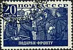 - Серия «Великая Отечественная война 1941—1945»: подарки — фронту, (30.XI.42) — тёмно-синяя. Типографская печать, перфорирована: линейная зубцовка 12½ (на каждые 2 сантиметра края марки приходится 12½ зубцов). В марочных листах по 50 (5×10) марок[1][2][10].