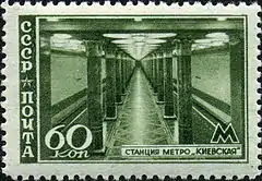 - Серия «Московский метрополитен имени В. И. Ленина»: «Киевская», зелёная. Глубокая печать, перфорирована: линейная зубцовка 12½ (на каждые 2 сантиметра края марки приходится 12½ зубцов). В марочных листах 100 (10×10) марок[1][15][17].