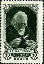 - Серия «100-летие со дня рождения академика А. П. Карпинского»: портрет А. П. Карпинского, тёмно-зелёная. Глубокая печать, перфорирована: линейная зубцовка 12½ (на каждые 2 сантиметра края марки приходится 12½ зубцов). В марочных листах 100 (10×10) марок[1][6][7].