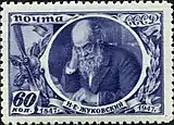 - Серия «100-летие со дня рождения академика Н. Е. Жуковского»: портрет Н. Е. Жуковского, серо-ультрамариновая. Глубокая печать, перфорирована: линейная зубцовка 12½ (на каждые 2 сантиметра края марки приходится 12½ зубцов). В марочных листах 100 (10×10) марок[1][6][8].