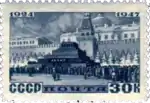 - Серия «День Международной солидарности трудящихся — 1 Мая»: демонстрация на Красной площади, зелёная. Глубокая печать, перфорирована: линейная зубцовка 12½ (на каждые 2 сантиметра края марки приходится 12½ зубцов). В марочных листах 65 (5×13) марок[1][15][14].