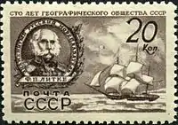 - Серия «100-летие Географического общества СССР»: мореплаватель Ф. П. Литке, лилово-коричневая. Глубокая печать, перфорирована: линейная зубцовка 12½ (на каждые 2 сантиметра края марки приходится 12½ зубцов). В марочных листах 100 (10×10) марок[1][6][8].