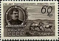 - Серия «100-летие Географического общества СССР»: путешественник Н. М. Пржевальский, лилово-коричневая. Глубокая печать, перфорирована: линейная зубцовка 12½ (на каждые 2 сантиметра края марки приходится 12½ зубцов). В марочных листах 100 (10×10) марок[1][6][8].