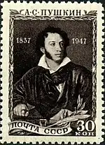 - Серия «110-летие со дня гибели А. С. Пушкина»: портрет А. С. Пушкина, тёмно-фиолетовая. Глубокая печать, перфорирована: линейная зубцовка 12½ (на каждые 2 сантиметра края марки приходится 12½ зубцов). В марочных листах 100 (10×10) марок[1][11][12].