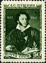 - Серия «110-летие со дня гибели А. С. Пушкина»: портрет А. С. Пушкина, тёмно-зелёная. Глубокая печать, перфорирована: линейная зубцовка 12½ (на каждые 2 сантиметра края марки приходится 12½ зубцов). В марочных листах 100 (10×10) марок[1][11][12].