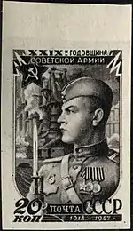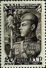 - Серия «29-я гоодовщина Советской Армии»: боец Советской Армии, чёрно-коричневая. Глубокая печать, без зубцов. В марочных листах 100 (10×10) марок[1][11][12].