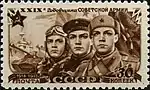 - Серия «29-я гоодовщина Советской Армии»: пехотинец, моряк и лётчик, коричневая. Глубокая печать, без зубцов. В марочных листах 100 (10×10) марок[1][11][12].