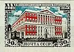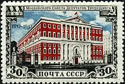 - «30-летие Московского Совета депутатов»: здание Моссовета, красная, чёрная, голубая, размер рисунка 41,5×27,5 мм. Фототипия, без зубцов. В марочных листах 72 (9×8) марок[1][13][14].