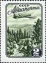 - Авиапочта: самолёт над тайгой, серо-зелёная. Глубокая печать, перфорирована: комбинированная гребенчатая зубцовка 12:12½ (на каждые 2 сантиметра края марки приходится 12:12½ зубцов). В марочных листах 72 (12×6) марок[2][6][7].