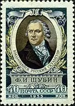 - «150-летие со дня смерти скульптора Ф. И. Шубина»: автопортрет, многоцветная, фон зелёно-коричневый. Офсетная печать, перфорирована: линейная зубцовка 12½ (на каждые 2 сантиметра края марки приходится 12½ зубцов). В марочных листах по 100 (10×10) и 90 (9×10) марок. Встречается разновидность марки (ЦФА [АО «Марка»] № 1855А) на голубоватом фоне[2][8][9].