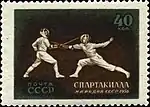 - Спартакиада народов СССР: фехтование, красно-коричневая, сине-зелёная, фон светло-серый. Разновидность (ЦФА [АО «Марка»] № 1916А) — фон жёлтый. Офсетная печать, перфорирована: комбинированная гребенчатая зубцовка 12½:12 (на каждые 2 сантиметра края марки приходится 12½:12 зубцов). Разновидность (ЦФА [АО «Марка»] № 1916С) (Mi #1858C): линейная зубцовка 12½ (на каждые 2 сантиметра края марки приходится 12½ зубцов). В марочных листах 72 (6×12) марок[2][6][7].