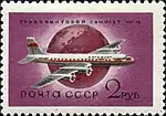 - Серия «Гражданский воздушный флот СССР» выпускалась с 11 августа 1958 по 16 января 1959 года. На марке (ЦФА [АО «Марка»] № 2195) — турбовинтовой самолёт Ил-18, чёрная, красная, коричнево-лиловая. Офсет, перфорирована: комбинированная гребенчатая зубцовка 12:12½ (на каждые 2 сантиметра края марки приходится 12:12½ зубцов). В марочных листах 100 (10×10) марок[6][7][8]. Кроме того, в 1958 году была выпущена разновидность (ЦФА [АО «Марка»] № 2188) (Mi #2193B) — турбовинтовой самолёт Ил-18, чёрная, красная, коричнево-лиловая в беззубцовом варианте, тиражом 140 000 экземпляров[7][8].