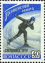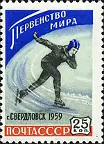 - Первенство мира по конькобежному спорту среди женщин, Свердловск-1959. На марке (ЦФА [АО «Марка»] № 2277) — спортсменка на дистанции, многоцветная. Офсет, перфорирована: комбинированная гребенчатая зубцовка 12½:12 (на каждые 2 сантиметра края марки приходится 12½:12 зубцов). В марочных листах 100 (10×10) марок[2][9][10].