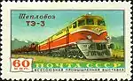 - Серия «Всесоюзная промышленная выставка»: тепловоз ТЭ-3, многоцветная. Офсетная печать, перфорирована: линейная зубцовка 12½ (на каждые 2 сантиметра края марки приходится 12½ зубцов). В марочных листах 100 (10×10) марок[7][8][9]. Предыдущая марка (ЦФА [АО «Марка»] № 2271) (Mi #2188) «Атомный ледокол „Ленин“» серии «Всесоюзная промышленная выставка» была выпущена в обращение 31 декабря 1958 года[7][8].