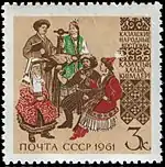 - Серия «Костюмы народов СССР»: на марке (ЦФА [АО «Марка»] № 2525) — казахские костюмы, многоцветная. Штриховой офсет, перфорирована: гребенчатая зубцовка 11½ (на каждые 2 сантиметра края марки приходится 11½ зубцов). Разновидность (ЦФА [АО «Марка»] № 2525А) (Mi #2564C) с линейной зубцовской 12½. В марочных листах 20 (4×5) марок[2][6][9].