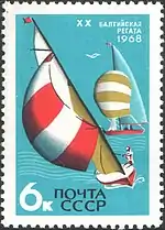 - Серия «Международные спортивные соревнования года»: Балтийская регата, многоцветная. Офсетная печать на мелованной бумаге, перфорирована: комбинированная гребенчатая зубцовка 12:12½ (на каждые 2 сантиметра края марки приходится 12:12½ зубцов). В марочных листах по 25 (5×5) марок[2][6][7].