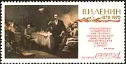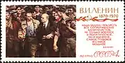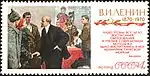 - Серия «В. И. Ленин в произведениях советских художников»: на многоцветной марке «В. И. Ленин на первомайской демонстрации» по картине И. Бродского 1927 год, оформление В. Пименова. Красный типографский текст, цитата В. И. Ленина: «Мы — противники национальной вражды, национальной розни, национальной обособленности. Мы международники, интернационалисты». Офсетная печать на мелованной бумаге, перфорирована: гребенчатая зубцовка 12½ (на каждые 2 сантиметра края марки приходится 12½ зубцов). В марочных листах по 15 (3×5) марок[2][6][7].