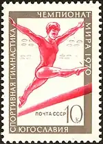 - Серия «Чемпионаты мира»: гимнастика, розово-карминовая, серо-оливковая. Глубокая печать на мелованной бумаге, перфорирована: рамочная зубцовка 11½ (на каждые 2 сантиметра края марки приходится 11½ зубцов). В марочных листах по 50 (10×5) марок[2][10][12][13].
