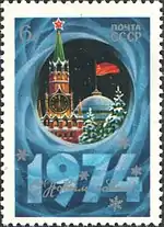 - Новогодняя марка «С Новым, 1974 годом!»: на многоцветной марке (ЦФА [АО «Марка»] № 4290) — Московский Кремль, текст «С Новым годом! 1974». Офсетная печать на мелованной бумаге с лаковым покрытием, перфорирована: комбинированная гребенчатая зубцовка 12:12½ (на каждые 2 сантиметра края марки приходится 12:12½ зубцов). В марочных листах 50 (10×5)[2][6][7].