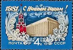 - Новогодняя марка «С Новым, 1981 годом!» На многоцветной марке (ЦФА [АО «Марка»] № 5138) — Дворец съездов и Спасская башня Кремля, многоцветная. Офсетная печать на мелованной бумаге с лаковым покрытием, перфорирована: комбинированная гребенчатая зубцовка 12½:12 (на каждые 2 сантиметра края марки приходится 12½:12 зубцов). В марочных листах 36 (6×6) и малые листы (кляйнбогены) по 16 (4×4) марок[2][21][22].