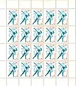 - «Лыжные гонки» — почтовый блок 60×90 мм серии «XIII зимние Олимпийские игры в Лейк-Плэсиде». На многоцветной марке лыжник. Глубокая печать, перфорирована: комбинированная рамочная зубцовка 11½:12 (на каждые 2 сантиметра края марки приходится 11½:12 зубцов)[2][10][5][6].
