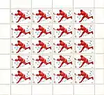 - Почтово-благотоворительный выпуск Игры XXII Олимпиады. Москва-80. На марке (ЦФА [АО «Марка»] № 5039) — спринтерский бег, многоцветная. Офсетная печать, перфорирована: комбинированная гребенчатая зубцовка 12½:12 (на каждые 2 сантиметра края марки приходится 12½:12 зубцов). В марочных листах 36 (6×6) и малые листы (кляйнбогены) по 20 (4×5) марок[2][10][11][12].