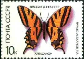 - Серия «Красная книга СССР: бабочки». На многоцветной марке (ЦФА [АО «Марка»] № 5801) Алексанор (лат. Papilio alexanor). Офсетная печать, перфорирована: комбинированная гребенчатая зубцовка 12½:12 (на каждые 2 сантиметра края марки приходится 12½:12 зубцов). Памятный чёрный текст: «Красная книга СССР», а также латинское и русское название изображённой бабочки. В марочных листах 36 (6×6) марок[2][6][7][9].