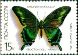 - Серия «Красная книга СССР: бабочки». На многоцветной марке (ЦФА [АО «Марка»] № 5802) Хвостоносец Маака (лат. Papilio maackii). Офсетная печать, перфорирована: комбинированная гребенчатая зубцовка 12½:12 (на каждые 2 сантиметра края марки приходится 12½:12 зубцов). Памятный чёрный текст: «Красная книга СССР», а также латинское и русское название изображённой бабочки. В марочных листах 36 (6×6) марок[2][6][7][9].