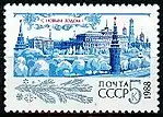 - Новогодняя марка «С Новым, 1988 годом!»: на многоцветной марке (ЦФА [АО «Марка»] № 5894) — вид на Кремль. Офсетная печать, перфорирована: комбинированная гребенчатая зубцовка 12:12½ (на каждые 2 сантиметра края марки приходится 12:12½ зубцов). В марочных листах 36 (6×6) и малые листы (кляйнбогены) по 8 (2×4) марок[2][10][11].