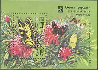 Почтово-благотворительный выпуск в фонд помощи Союзу филателистов СССР (25-летие): почтовый блок «Охрана природы — актуальная тема филателии»[Комм 9][2][3][19][20]. | 0,20+0,10 руб. |