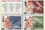 Зчіпка «50-річчя визволення території Білорусі, Росії та України від німецько-фашистських загарбників»: 50-річчя визволення території Росії; 50-річчя визволення території України; 50-річчя визволення території Білорусі. с укр. — «Сцепка «50-летие освобождения территории Белоруссии, России и Украины от немецко-фашистских захватчиков»), три марки с купоном»[1][14][17]: