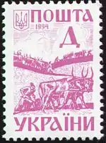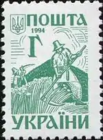 Третий выпуск стандартных марок независимой Украины (1994—2001)[24] был представлен знаками почтовой оплаты литерными номиналами: «А», «Б», «В», «Г», «Д», «Е», «Є» и «Ж»[1][25][26]. Они соответствуют заранее указанному Укрпочтой тарифу на пересылку корреспонденции, а также эквивалентны определённой сумме в гривнях или долларах США, стоимость для продажи последних рассчитывается по курсу НБУ[27].