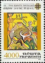 Сторіччя з часу відкриття В. В. Хвойкою трипільської культури (V—III тисячоліття до н. е.). с укр. — «Столетие с момента открытия В. В. Хвойкой трипольской культуры (V—III век до н. э.)»[1][18][19]. |