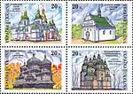 Зчіпка «Пам'ятки архітектури України. Храми» з купонами: Софійський собор у Києві Іллінська церква в Суботові Церква святого Юра в Дрогобичі Троїцький собор у Новомосковську (Новоселиця). с укр. — «Сцепка «Памятники архитектуры Украины. Храмы») с купонами: |