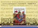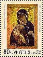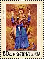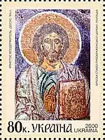 Блок «2000-ліття християнства», спільний випуск Україна-Росія-Білорусь: Богоматір Оранта, XI ст. Мозаїка Софійського собору, Київ; Христос Вседержитель, XII ст. Фреска Спасо-Преображенської церкви, Полоцьк; Богоматір Володимирська, ікона, XII ст. Державна Третьяковська галерея, Москва. с укр. — «Блок «2000-летие христианства», совместный выпуск Украина—Россия—Беларусь: